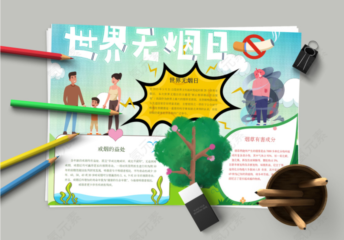 五:卡通形象世界无烟日手抄报模板