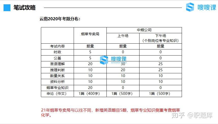 从笔试内容上来看,报考烟草专卖局的同学在提前准备笔试的时候肯定范围要广一点,多了时政、公基和英语。