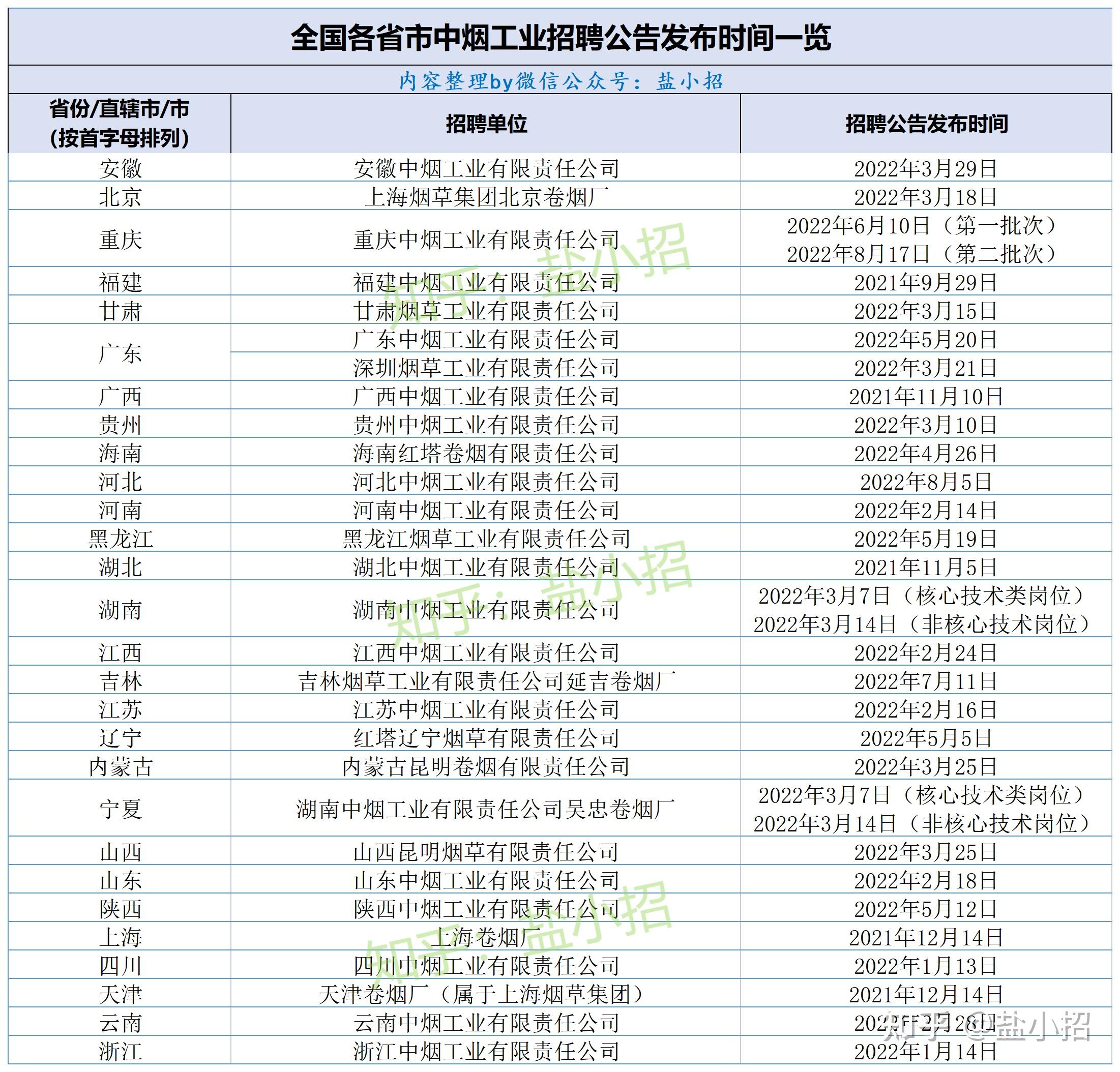 2025年不知招聘何时开始?全国各省市烟草专卖局和中烟工业招聘公告发布时间汇总!