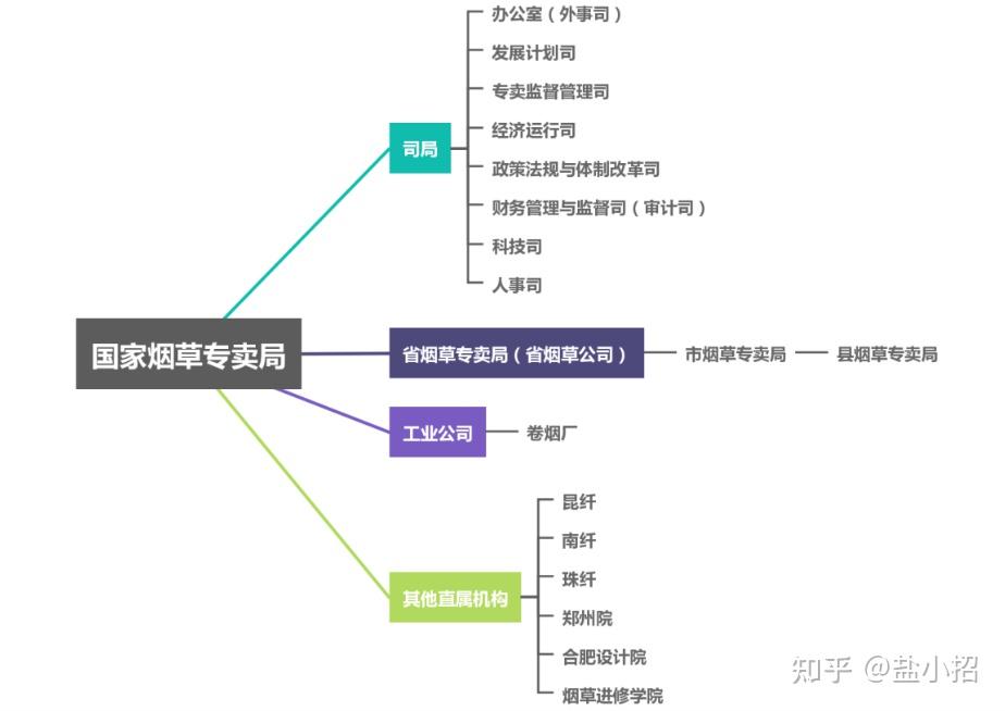 整个烟草系统一共分为四大块,分别为司局、省(市、县)烟草局、工业公司及其他直属机构。烟草局共有四个级别:国家烟草专卖局、省烟草局、市烟草局、县烟草局。一级管一级,一般是国家局管烟厂和省烟草局、省管市、市管县。