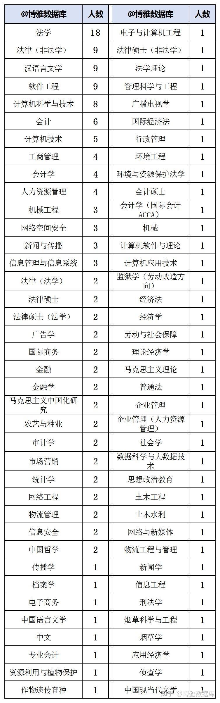 涉及专业76个。录用人数较多的专业:法学 、法律(非法学)、 汉语言文学 、软件工程 、计算机科学与技术 、会计。