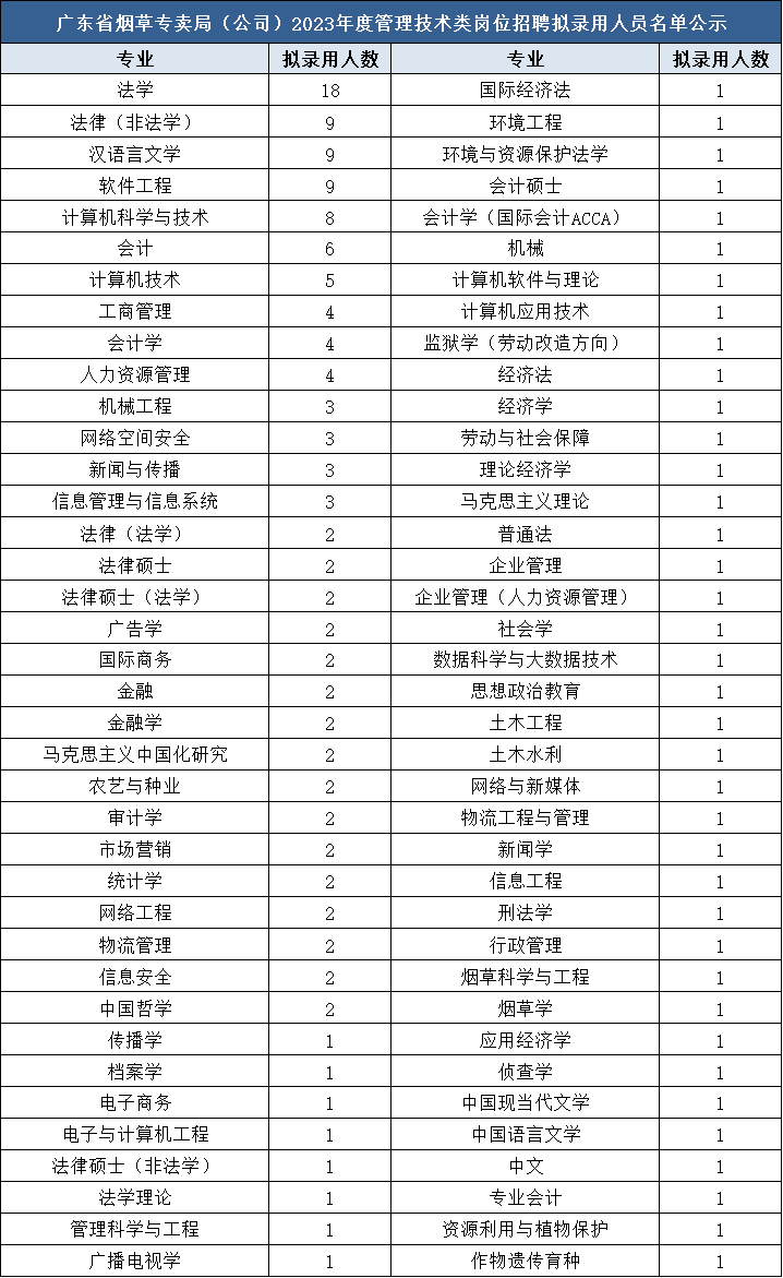 数据来源于广东省烟草专卖局(公司)2025年度管理技术类岗位招聘拟录用人员名单公示