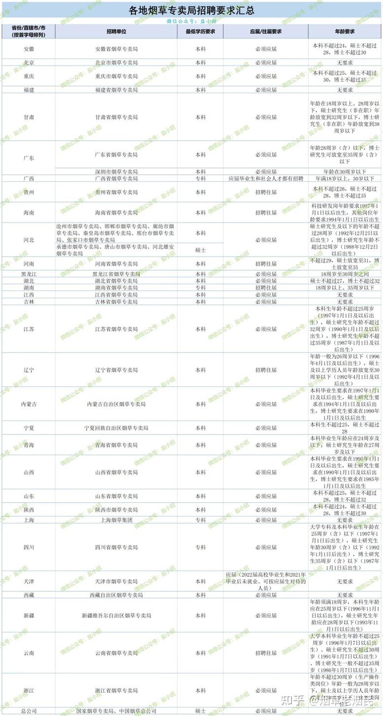 二、全国各地烟草招聘要求(节选自公众号:盐小招)