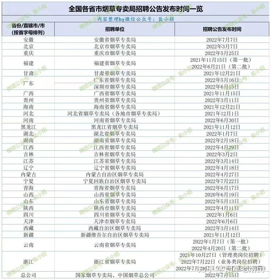 一、全国各地烟草招聘时间(节选自公众号:盐小招)