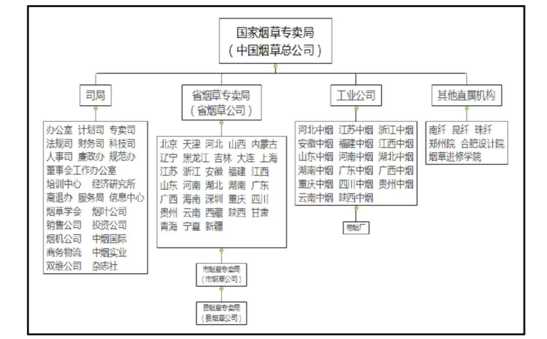 我们先来看看中国烟草公司的组织架构,中国烟草公司是由国家直接控股的国有企业,每一年纳税总额全国第一名。国家烟草专卖局和中国烟草总公司这是两块牌子一套人马,除此以外还有下设不同省份的中烟公司。烟草专卖局负责销售,中烟公司负责制造。