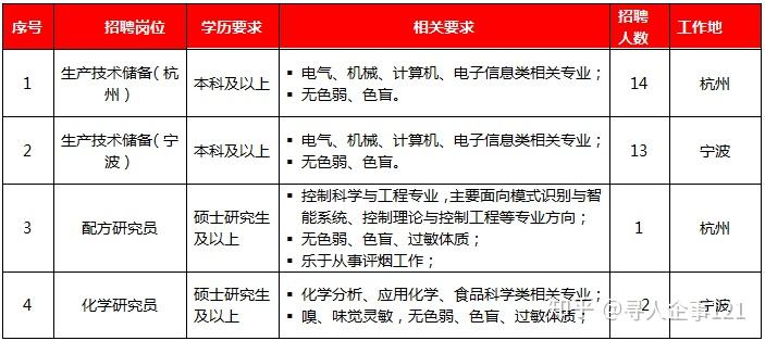 浙江中烟的岗位需求一共就三种4个:生产技术储备、配方研究院和化学研究员,专业呢,要求为电气、机械、计算机、化学、食品科学等相关方面都可以。工作地点集中在杭州和宁波两个地方。